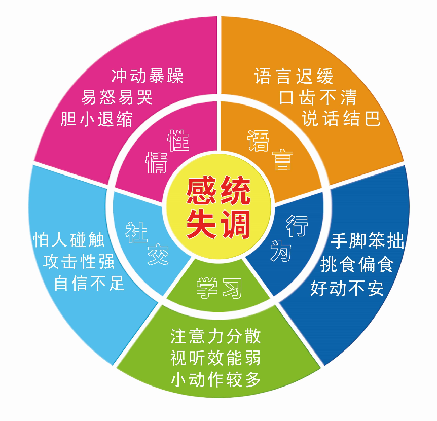 ? 感統對兒童的影響 知道了感統失調的原因,那感覺統合失調對兒童有怎樣的影響呢?下面我們用一副圖簡單了解一下吧。 我們怎么知道孩子是否有必要接受相關專業人員的評估,以明確孩子是否存在感統失調呢? 這里有三個尋求專業醫生幫助的正常理由: 1.如果孩子在某些“很自然的行為”方面做的很吃力,需要考慮尋求幫助。 行為問題包括:在地上爬、跑步、跳躍、攀爬、講話、聆聽、擁抱和玩耍行為吃力,那就表示孩子是需要進行感統方面的診斷了;如果他們是很自卑的,那答案也是肯定的,自卑是感統失調的明顯信號。 2.孩子的問題若對其他人造成了干擾,也需要考慮尋求專業幫助。 這些孩子在推倒別人時,會讓別人很煩;焦躁不安時會令老師很生氣,行為莽撞時會令父母擔心,但他們不知道自己為何總讓人不開心。如果孩子在家里(安全的場所)時天使,到了街上(無法預期且令人害怕的場所)卻變成魔鬼;在學校時天使(懂得自制),回到家里卻變成惡魔(一整天下來把他們累壞了);如果他們換了一個場合就好像變了個人似的,這也可能表示他們在發送求救信號。 ? 什么是感覺統合 感覺統合簡稱感統,是機體將各種感覺通路的信息輸入大腦,經過大腦對輸入信息進行加工、處理、解釋、比較、增強、抑制、聯系、統一,神經系統的不同部分才能協調整體工作,使個體與環境順利接觸,并作出適應性反應的能力.感統包括視覺、聽覺、味覺、嗅覺、觸覺、前庭覺和本體覺。感統是人類智慧的基礎,是孩子一切能力發展的根本。 對于那些感統失調極為嚴重的孩子來說,接受治療時相當重要的。對孩子進行感統治療,可以幫助孩子加工處理自己的各種感覺,讓孩子的神經系統更好地完善;可以提供孩子必備的生活能力,也能為孩子的未來奠定堅實穩定的基礎,才能勇敢地面對未來人生中的各種挑戰;可以幫助孩子順利地發展社交能力;可以讓孩子學習更有效率;還能夠改善孩子的情緒狀況和與家人之間的關系。